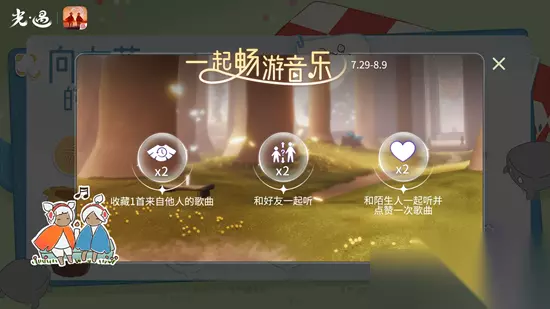 光遇有友节第二阶段任务有什么?光遇有友节第二波活动现已正式开启了,目前在游戏中玩家会有很多的活动玩法可以体验,可能有玩家还不清楚这次的第二波活动都有什么,下面小编就给大家整理了具体的活动一览,一起来看看吧! 光遇有友节第二阶段任务一览 一、活动时间:7月29日-8月9日 二、活动详情: 1、完成“收藏1首来自他人的歌曲”任务,可以获得两个限时斗篷。 2、完成“和好友一起听”任务能领到两个魔法。