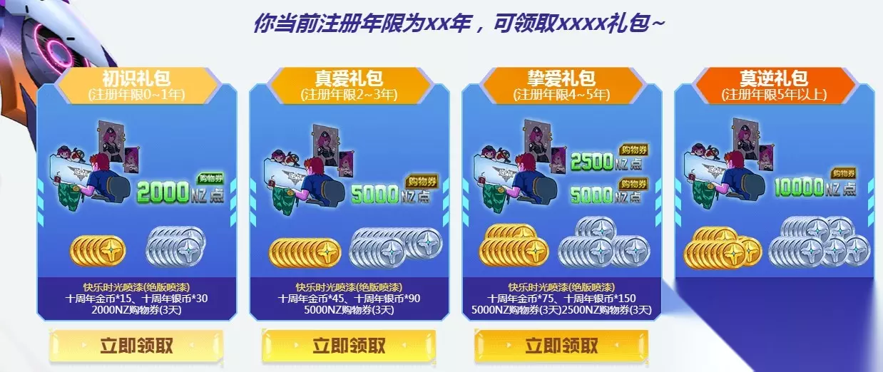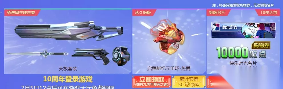 7月5日12点后开放领取,累计金币数额仅统计每周宝箱内获得的金币数量;补领仅可领取购物券,无法领取绝版名片。 玩家可通过周年系列活动赢取金币,在商城种兑换海量高额奖励,十年仅此1次,请勿错过相同载具/伴生灵/宠物/换肤卡/角色受唯一性限制只能拥有1个,请勿重复兑换,误操作无法回退。