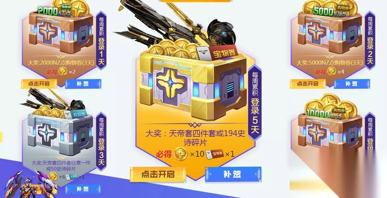《逆战》十周年庆典活动期间每日登录游戏即可开启10周年宝箱,最高可获得天帝套四件套或194史诗碎片,每周一零点将自动重置本周宝箱。 《逆战》十周年庆典活动 活动时间:7月版本更新后至2022年9月19日 每日登录游戏即可开启10周年宝箱,每周最多开启5次,每次保底必得十周年金币,最高可获得天帝套四件套或194史诗碎片,当日游戏30分钟,可获得1次补签机会,每周最多补签2次。每周一零点自动重置本周宝箱。
