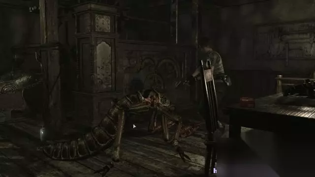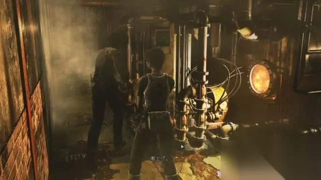 step13.比利与瑞贝卡一同返回到铰链机房内,这时候要分头行动,只有比利才能够转动铰链机,然后瑞贝卡就落到水池内拿取火纹钥匙(打开两道火纹门)。 这时候一条巨型蜈蚣出现,它一口咬住了瑞贝卡,现在自动会切换为比利,那么使用散弹枪对其头部连续开枪(大概7枪左右)就可以将其击毙。