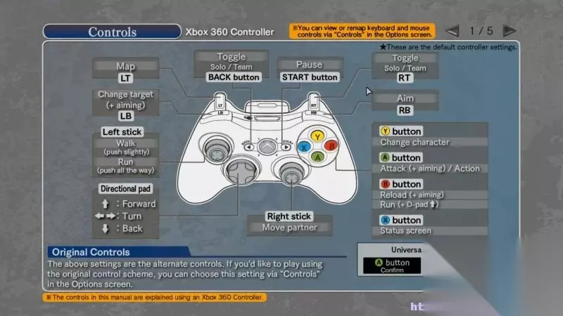 XBOX基本键位操作 LT键:地图; LB键:切换瞄准目标; 左摇杆:慢走/奔跑; 十字键:移动; back键/RT键:切换单人或团队模式; start键:暂停游戏; 右摇杆:移动同伴; RB键:瞄准; Y键:变更角色; A键:攻击(瞄准)/动作/确定; B键:填充弹药(瞄准)/奔跑/取消; X键:打开属性界面;