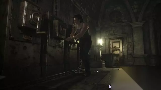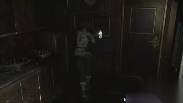 step14.这时候从铰链机房东面的楼梯落到走廊内,穿过尽头的门返回到大厅二层,将白色雕像先放在天秤上。 继而落回到一层进入到东面的厨房内,使用火纹钥匙打开通往厨房的门(第一次使用火纹钥匙,之后还需要用一次),在厨房当中可以拿到空瓶、草药(红)以及机油。 然后切换为比利,进入到属性界面,将机油和比利的个人物品——火机进行合成,那么火机就可以点燃东西了。