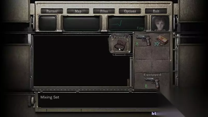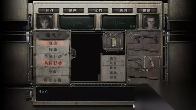 属性界面 同伴:可以在这里选择团队模式或单人(分头行动)模式,并且可以选择同伴之间交换道具。 地图:打开地图界面。 文件:查看已获取的文件。 设置:打开设置菜单。 退出:返回游戏界面。 切换角色:当角色头像置于右侧,表示玩家此时正在操控改名角色。 HP:屏幕中央的两个脉搏显示器表示两名角色的健康状态,绿色为健康、黄色为受伤、红色为生命垂危。 物品栏:物品栏一共有6个格子,意味着一名角色最多可以放置6样道具或更少,因为有些武器道具需要占2个格子。 道具可以在物品栏中进行合成,只需要点击该道具,然后选择合成(combine),再选择另一个道具即可。 某些道具如皮包之类的,是可以打开的,选择开启(examine)即可。