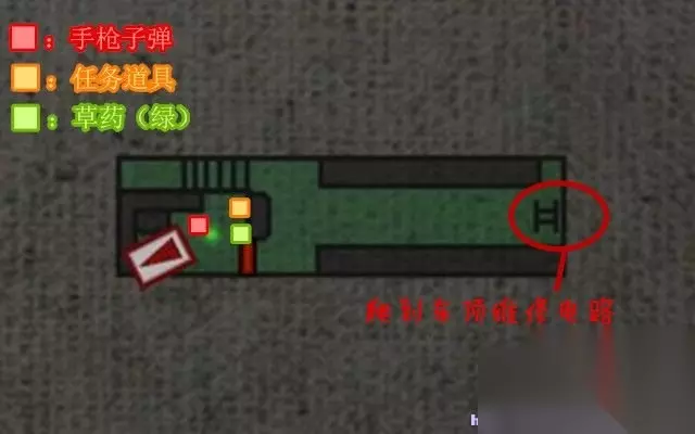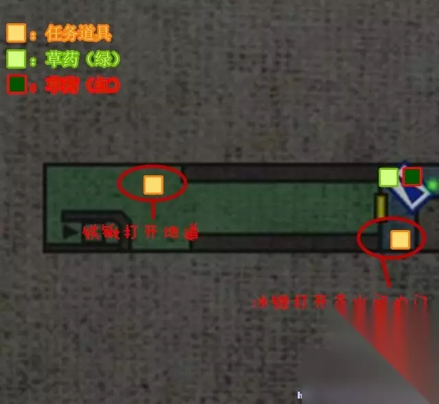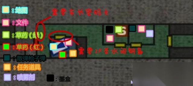 地图界面 缩放地图:按Q键和E键缩放地图。 切换地图楼层:按W键、S键切换地图楼层,如果未有获得完整该地区地图或者是未走遍这个地区,那么部分楼层暂时不会在地图中显示。 标志:绿圈、红圈表示药物,“S”表示打字机(存档点)位置。 红色三角形:表示瑞贝卡·查姆博斯所在位置。 蓝色三角形:表示比利·柯恩所在的位置。