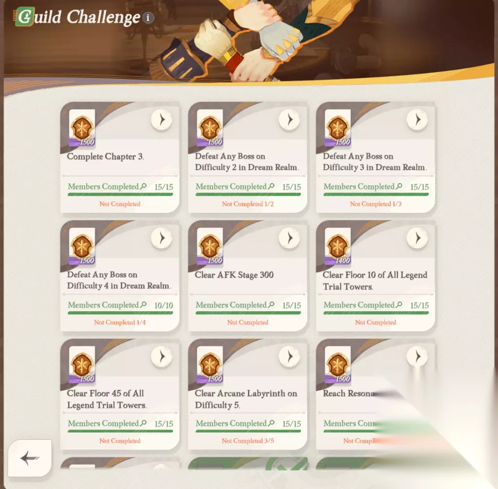 公会挑战 1. 公会挑战由一系列团队任务组成。只有达到一定数量的公会成员共同满足要求后,您才能领取奖励。 2. 公会挑战完成后,所有公会成员均可领取奖励。 3. 如果您的新公会在您加入之前完成了公会挑战,您需要自行完成这些挑战才能获得奖励。 公会挑战列表: 达到共振等级。 50. 达到共振等级。 100 达到共振等级。 240 完成 AFK 阶段 50 完成 AFK 阶段 100 完成 AFK 阶段 150 完成 AFK 阶段 200 完成 AFK 阶段 300 通关所有传奇试炼塔第 10 层。 通关所有传奇试炼塔的第 45 层。 通关所有传奇试炼塔第80层。 通关难度 2 的奥术迷宫 击败梦境 1 难度的任意 Boss 击败梦境 2 难度中的任意 Boss 在梦境中击败难度 3 的任意 Boss 在梦境中击败难度 4 的任意 Boss 完成第 1 章 完成第 2 章 完成第 3 章 在竞技场中达到 1500 点 在竞技场中达到 2000 点 《剑与远征:启程》新手攻略指南 探索与收集:探索、收集宝藏、完成任务、尝试英雄。 世界地图和宝箱:利用路径点,找到物品的宝箱。 战斗模式:参与竞技场,通过进步解锁新模式。 公会会员:加入公会,参加团战和任务。 NPC战斗:与NPC交战,使用快速战斗来提高效率。 商场购物和英雄管理:智能购物、招募和提升英雄。 装备&共鸣厅:按职业装备英雄,在共鸣厅升级。 每周活动和任务:参与活动,完成不同的任务。 社交联系:结交朋友以获取礼物和代币。 世界地图和宝箱