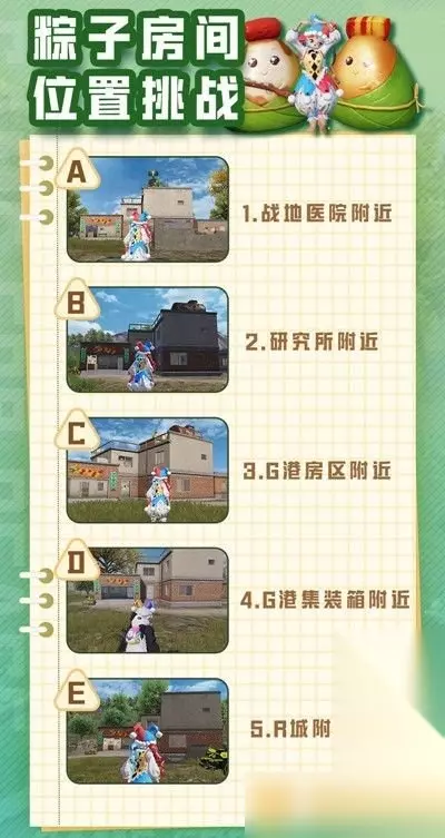 《和平精英》端午粽子位置介绍 一、粽子房间位置汇总: 1、2022端午节模式中的和平精英游戏,在海岛上发现了特殊的粽子房间。 2、大家可以进入粽子房间中领取粽子材料包,打开材料包可以获取制作粽子的材料和新玩法。 3、粽子房间的外形与假车库类似。在房间的二楼还可以找到蒸粽子的大蒸笼。