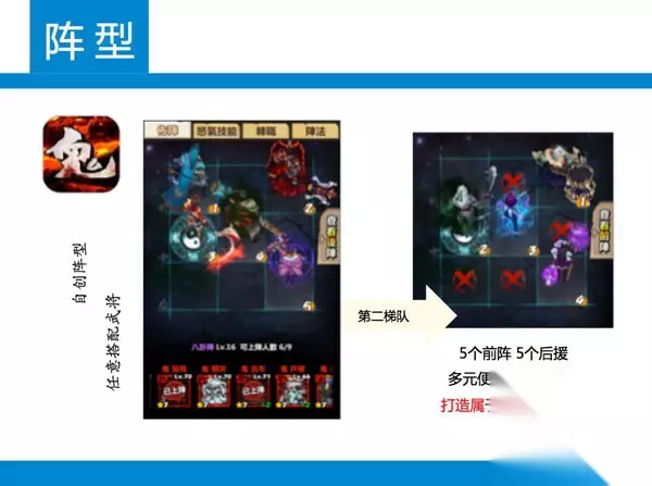 《鬼舞三国》中武将分为7个等级,最高的7星武将就是鬼舞将,而通过招募或商店可以获得的最高品质为5星武将,五星武将通过进化可以成长为6星真武将,7星鬼舞将是从6星魔化而来。 这是一套完整严谨的进阶之路,代表着武将不断变强的历程,也代表着王侯将相宁有种乎,即使你出生时只是一个五星普通武将,只要不放弃不抛弃,一路进阶,最终也可以成为强大的鬼舞者! 评价:5星 鬼舞将这一设定就很新颖,成长路线也非常完善,从普通人进化成鬼的思路简直惊艳,绝对的满分5星! 【三】 排兵布阵策略指挥战斗