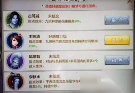天龙八部手游峨眉九阴神爪技能指点怎么选?不清楚的同学快来了解一下吧。 古笃诚简单粗暴加攻击不多解释,木婉清流血持续时间增加100%这个就要从九阴白骨爪的伤害机制说起了,九阴是个持续伤害技能,附加流血效果,流血的持续伤害跟技能的瞬间伤害是差不多的,木婉清的指点直接提升了2倍的持续输出,试炼,煞星很好用,pk如果对面有净化那就不好用了,鸠摩智,简单粗暴,把技能从一个单体输出变成aoe伤害,挂机,打群架很好用,李阿姨这里重点说下,这是个神级指点,在我心中的地位甚至比乔峰还要高一个档次,把技能直接变成了逍遥的放大有木有!有木有!增伤百分之15,不管干什么都有用对于本来就弱于输出的峨眉来说,直接提升了峨眉的输出水平!