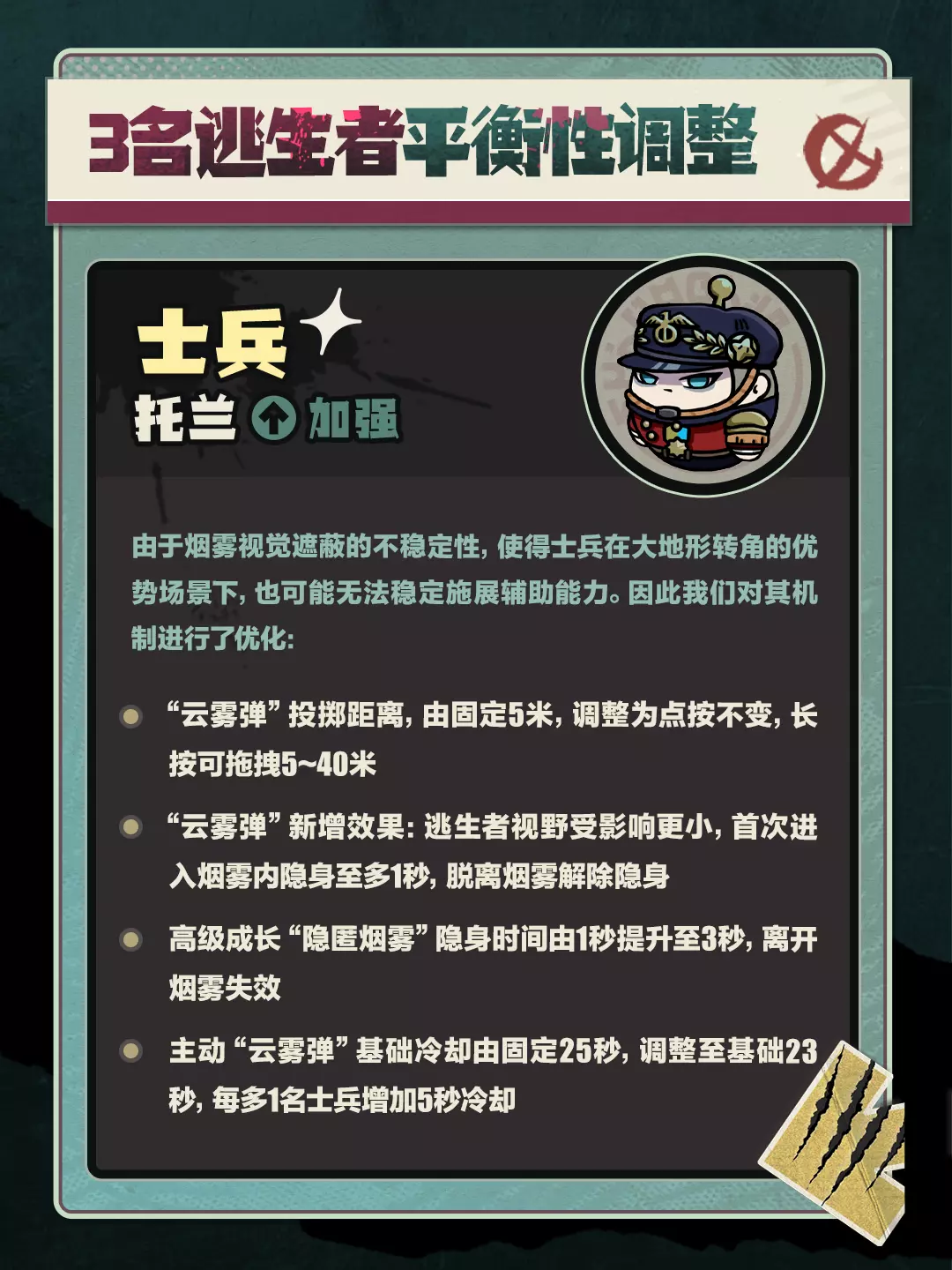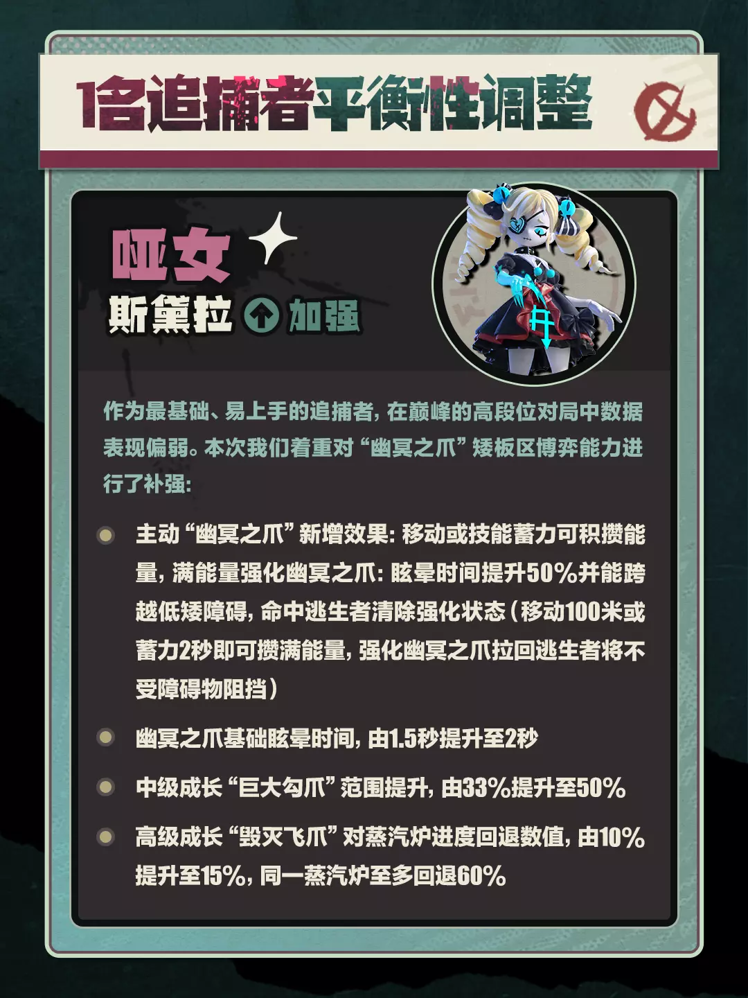 11月20日(周四)更新维护后,“逃出惊魂夜”将迎来新赛季版本改动!我们对部分角色进行了适当补强,以提升其在当下版本的适应能力,详细调整内容戳图查看~
