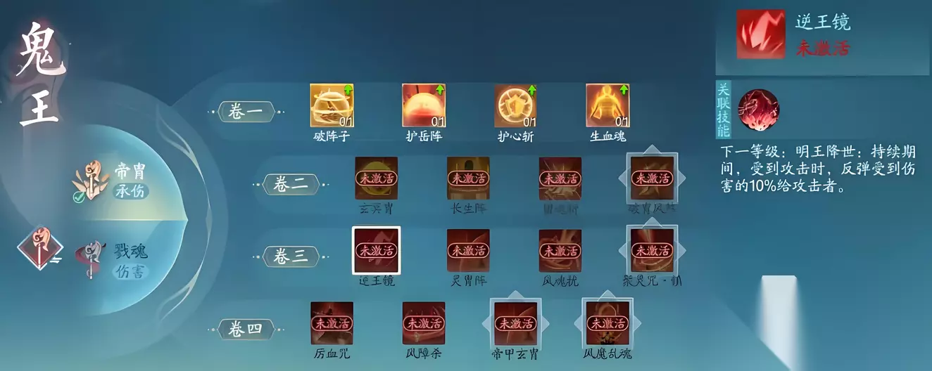 在天书加点方面,鬼王有两个不同的方向,分别是纯坦克和输出类型。先来看一下纯坦克,在天书加点上,最关键的就是自身生存以及团队增益。破阵子、玄冥胄、生血魂、护心斩这几个一定要点。破阵子可以使得锁魂追命、凌霄碎魂等技能,在勇气状态下有额外的防御加成,加强生存。玄冥胄的效果是开启冥王降世后恢复自身血量并持续恢复血量。生血魂的效果提高血气上限,增加能量上限。护心斩的效果是裂地斩能获得减伤以及额外的防御加成,是很好用的减伤类技能。