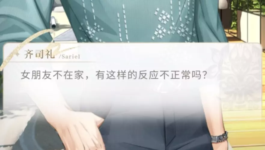 这是手游《光与夜之恋》的剧情内容,展示了角色冉遗与玩家的对话互动,还提及了角色齐司礼相关的趣味情节,呈现了游戏里的温馨室内场景与趣味剧情片段。