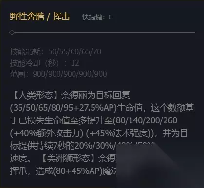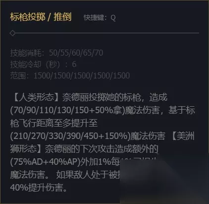 1、奈德丽技艺主Q副E!Q技艺在人类形状是投掷标枪!对掷中的仇人形成损伤!越远损伤越高!美洲狮形状是让奈德里的下次打击形成分外损伤!