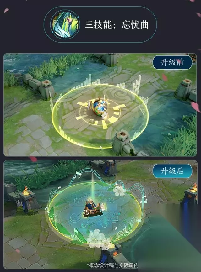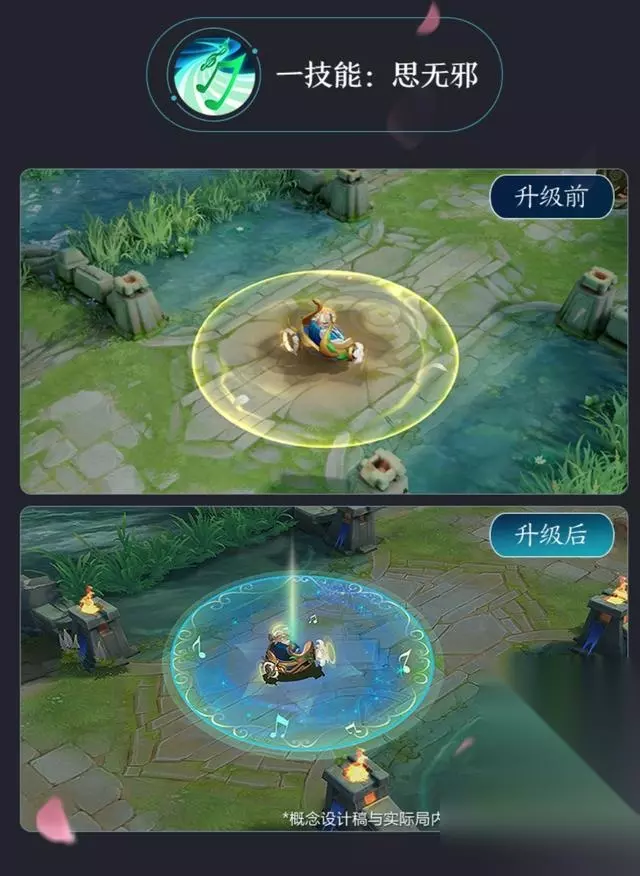 二技能的改动也非常明显,百合花更加清晰明了,后面还拖着音符小尾巴,看起来更加细致了。虽然不知道天美这次为什么要对福利皮进行升级,但是对于玩家而言,这样的调整还是非常良心的,希望这样的规划可以多几次。 蔡文姬繁星游吟三技能升级前后对比