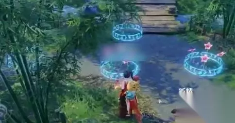 3.触发任务之后,在地面会出现六个石板,两边各三个,如下图: 4.玩家和你的好友分别站在两边三个石板的中间,就可以点亮石板; 5.点亮石板之后就可以完成任务,解锁灵兜兜领取奖励了。