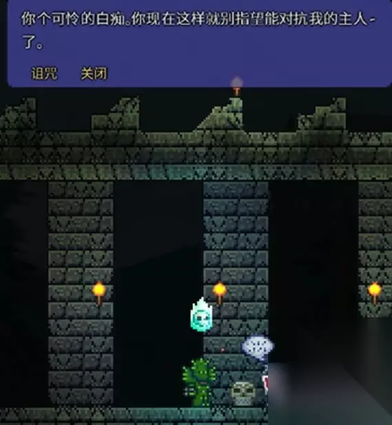 地牢是一种特殊建筑地形,入口处的地形和其它地形不一样,很容易辨认,地牢入口会有一个NPC老人,在夜晚的时候与NPC对话,点击【 诅咒】就会召唤出BOSS骷髅王。 地牢是一种特殊建筑地形,入口处的地形和其它地形不一样,很容易辨认,地牢入口会有一个NPC老人,在夜晚的时候与NPC对话,点击【诅咒】就会召唤出BOSS骷髅王,击败骷髅王之后就可以进入地牢,进行地牢的探索;如果没有击败骷髅王就进入地牢,达到一定深度后,就会刷出一个秒杀伤害的地牢守卫阻止玩家进入地牢。
