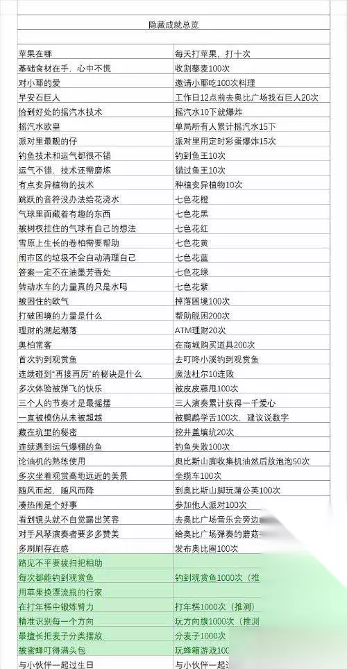 1、苹果在哪 每天打苹果,打十次 2、基础食材在手,心中不慌 收割蓼麦100次 3、对小耶的爱 邀请小耶吃100次料理 4、早安石巨人 工作日12点前去奥比广场找石巨人20次 5、恰到好处的摇汽水技术 摇汽水10下就爆炸 6、挥汽水欧皇 单局所有人累计摇汽水15下 7、派对里最靓的仔 派对里用定时彩蛋爆炸15次 8、钓鱼技术和运气都很不错 钓到鱼王10次 9、运气不错.技术还需磨炼 错过鱼王10次 10、有点变异植物的技术 种植变异植物10次 11、跳跃的音符没办法给花浇水 七色花橙 13、气球里面藏着有趣的东西 七色花黑 14、被树权挂住的气球有自己的想法 七色花红 15、雪原上生长的卷柏需要帮助 七色花黄 16、闹市区的垃圾不会自动清理自己 七色花蓝 17、答案一定不在油墨芳香处 七色花绿 18、转动水车的力量真的只是水吗 七色花紫 19、被困住的欧气 掉落困境100次 20、打破困境的力量是什么 帮助脱困200次 21、理财的潮起潮落 ATM理财20次 22、奥柏常客 在商城购买道具200次 23、首次钓到观赏鱼 去叮咚小溪钓到观赏鱼 24、连续碰到再接再厉的秘决是什么 魔法杜尔10连败 25、多次体验被弹飞的快乐 被皮皮藤甩100次 26、三个人的节奏才是最摇摆 三人演奏累计获得一千爱心 27、一直被模仿从未被超越 被鹦鹅学舌100次.建议说数字 28、藏在坑里的秘密 挖井盖填坑20次 29、连续遇到运气爆棚的鱼 钓鱼失败100次 30、论油机的熟练使用 奥比斯山脚收集机油然后放泡泡50次 31、多次坐着观赏高地远近的美景 坐缆车100次 32、随风而起,随风而降 到奥比斯山脚玩蒲公英100次 33、凑热闹是个好事 参加他人派对100次 34、看到镜头就不自觉露出笑容 去奥比广场音乐会旁边的大头贴拍黑50次 35、对手风琴演奏者要多多赞美 给奥比广场弹奏的蘑菇打赏50次 36、多刷刷存在感 发布奥比圈100次 37、路见不平要拔扫把相助 每次都能钓到观赏鱼 38、钓到观赏鱼1000次(推测】 用苹果换漂流瓶的行家 39、在打年糕中锻炼臂力 打年糕1000次(推测) 40、精准识别每一个方向 玩方向旗1000次(推测) 41、最擅长把麦子分类摆放 分麦子1000次(推测) 42、被蜜蜂叮得满头包 玩蜂箱游戏1000次(推测) 43、与小伙伴一起过生日 与小伙伴一起过生日一次 以上就是小编为大家带来的《奥比岛手游》隐藏成就大全最新2023的全部内容,还想了解更多关于奥比岛手游攻略的小伙伴就来233乐园攻略看看吧!看完你这就对了,希望能对大家有所帮助。