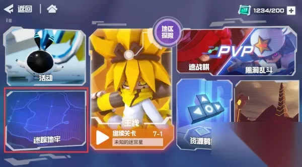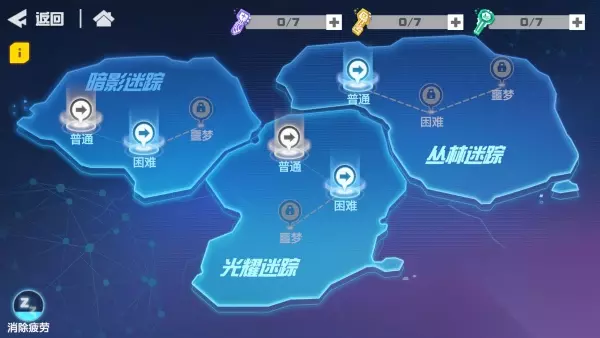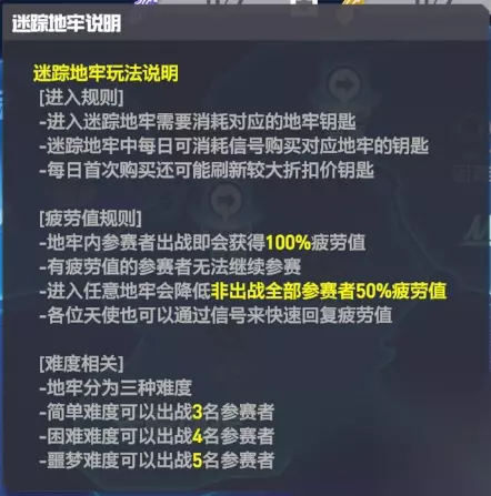 迷踪地牢入口 进入失落地下城界面后,可以看到3张不同的地图。这3张地图都会掉落元力研究笔记、元力强化剂和元力转化剂。不同地图的主力掉落倾向也不同。 每张地图都分为三个难度等级:简单、困难、噩梦。完成上一个难度级别即可解锁下一个难度级别。难度越高,通关后获得的道具就越丰富。为了获得更丰厚的奖励,天使们请更加努力吧! 难度更高的地图将让更多的参赛者参与探索。三名参赛者可以参加简单难度的比赛;四名参赛者可以参加困难难度级别的比赛;五名参赛者可以在噩梦难度级别上比赛。 迷踪地牢玩法界面 地牢极其危险,没有相应的钥匙任何人都不允许进入!因此,天使在进入关卡时需要消耗1把对应的钥匙,而钥匙需要使用【信号】来兑换。