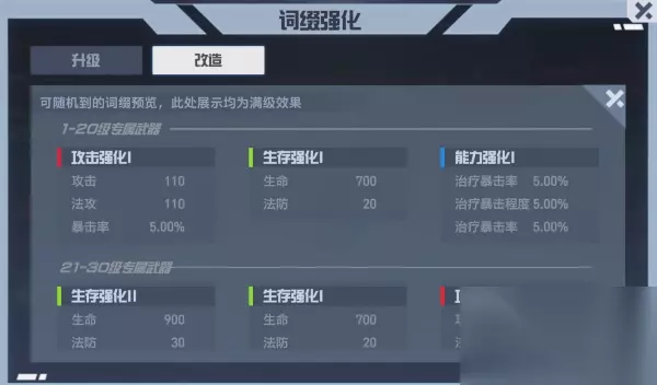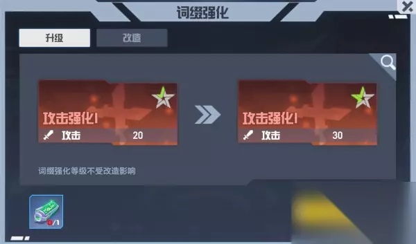 词缀强化界面预览 词缀的转化也需要消耗【元力转化剂】,每次转化会消耗20个【元力转化剂】。根据专属武器的等级不同,修改后的词缀的等级和属性也会有所不同。专属武器等级越高,词缀库越大,变形时可以随机生成新的词缀。 届时,天使们可以点击界面右上角的放大镜图标来查看词缀列表。