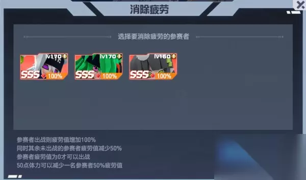 buff房间与buff选择界面 经过战斗的参赛者肯定会感到有些疲惫。当天使完成关卡时,刚刚玩过的参赛者的疲劳值会增加100%,并且无法再次进入关卡;中途失效或退出也按100%疲劳值计算。 每当天使选择另一位疲劳值为0的参赛者进行战斗一次时,他可以恢复其他参赛者50%的疲劳值。当然,心急的天使也可以选择用信号来恢复参赛者的疲劳值。 1个信号点对应疲劳值的1%。