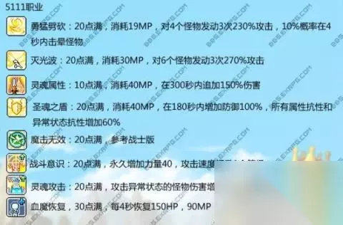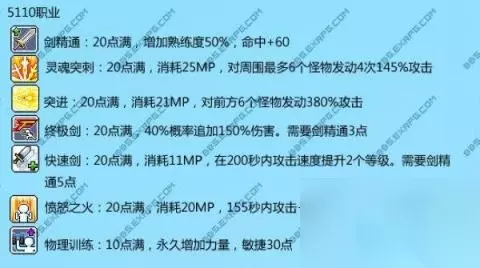 四转:(共241点) 进阶灵魂之盾:30点满,减少伤害20%,需要灵魂之盾15点 必满 剑专修:30点满,增加熟练度70%,攻击+30,暴击最小伤害+15%需要剑精通20点 必满,不解释。 进阶终极攻击:30点满,60%概率追加2次250%的攻击,攻击+30 必满,不解释 灵魂之怒:30点满。240秒内攻击增加60%,暴击增加20%,最小暴击伤害增加15% 必满不解释 战斗精通:10点满,无视防御40% 必满不解释 稳如泰山,30点满 必满不解释 气功波:30点,对6个怪发动4次380%攻击 群攻主技能,必满 灵魂穿刺:30点满,对1个怪物发动4次290%攻击,10%晕6秒 单攻主技能,必满 冒险岛勇士:30点满 量力而行 勇士意志:5点满 推荐最低加3点