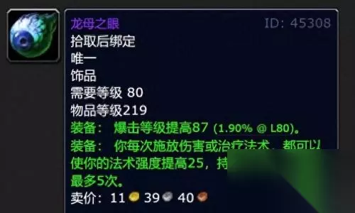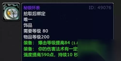 属性和它类似的饰品是10人奥杜尔的龙母之眼,拥有87暴击等级和125点法伤,属性还比秘银怀表差一丝丝,因此秘银怀表看上去是一个200装等的装备,实际价值达到了219装等。