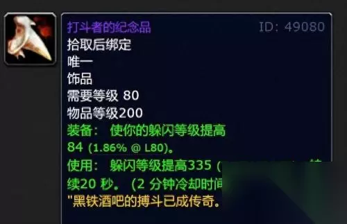 坦克还有一件饰品“打斗者的纪念品”,这是一件被动和主动都提供躲闪属性的装备,开启主动效果时提供的总躲闪达到了9%。不过WLK版本的坦克主流走血甲+减伤路线,大量提供躲闪等级的饰品,只能提供不稳定的减伤,并不是非常好的选择。