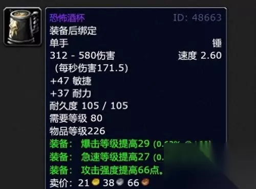 美酒节还可以获取一把非常强大的单手武器恐怖酒杯,装等226,拥有171点秒伤,这是前期增强萨和死亡骑士的毕业级装备,属性甚至比25人克尔苏加德掉落的武器还要好!