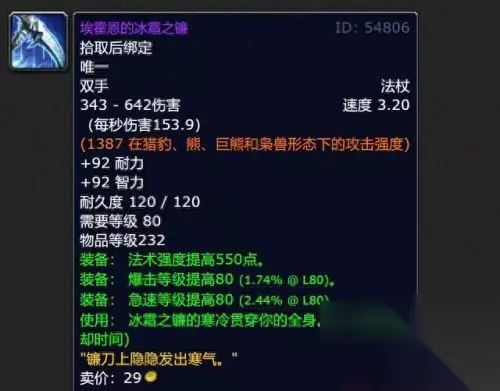 埃霍恩的冰霜之镰的物品等级高达232点,而玩家在5人英雄本获取的装备只有200装等,25人NAXX可以获取213装等的武器,只有尾王克尔苏加德才有机会获取226装等的武器,因此冰霜之镰完全碾压P1阶段的装备,和P2奥杜尔出品的装备平齐。