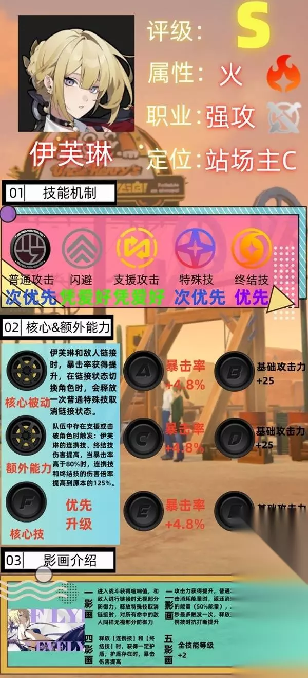 核心技 【核心被动】:伊芙琳和敌人链接时,暴击率获得提升,在链接状态切换角色时,会释放一次普通特殊技取消链接状态。 【额外能力】:队伍中存在【支援】或【击破】角色时触发:伊芙琳的【连携技】、【终结技】伤害提高,当暴击率高于80%时,【连携技】和【终结技】的伤害倍率提高到原本的125%。 影画 伊芙琳的一影画是进入战斗获得喧响值,和敌人进行链接时无视部分防御力,释放特殊技取消链接时,对所有命中的敌人同样无视部分防御力;二影画是攻击力获得提升,普通攻击消耗能量时,返还消耗的能量(50%能量),25秒最多触发一次,释放连携技时抗打断提升;四影画是释放【连携技】和【终结技】时,获得一定护盾,护盾存在时,暴击伤害提高;六影画是释放【连携技】和【终结技】时,进入增幅状态,发动普攻、冲刺攻击和特殊技时,对敌人额外造成一次火属性的伤害,最多触发16次。 音擎推荐及驱动盘搭配 音擎