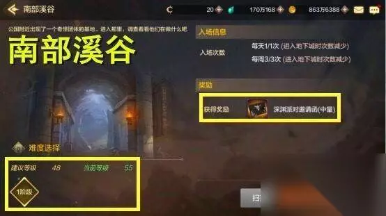 【三】南部溪谷 当角色达成48级,委托任务南部溪谷开启,这和曾经的端游的南部溪谷类似,属于周常副本,每周每个角色可以挑战3次,每天只能挑战一次,可以产出大量的深渊邀请函,深渊挑战书,不掉落史诗装备,但是,有了深渊票,才有资格刷深渊,才有可能爆出无影剑。