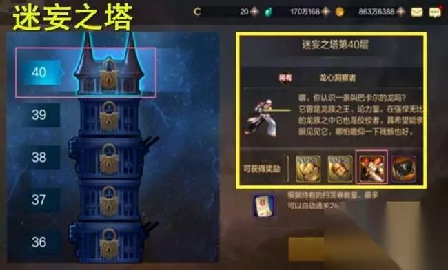 【二】迷妄之塔 同样是17级开启的委托任务,迷妄之塔一共40层,通关5的倍数层,会奖励泰拉币,通关其余层,会奖励神器装备和金币,最重要的是,通关最后一层第40层,会几率获取史诗装备、深渊邀请函,在体验服已经有多位勇士一发入魂,翻牌出了无影剑,他们在体验服把运气用光了,正式服就该看我们的表演了。