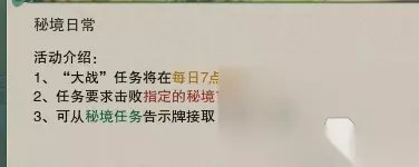 大战就是每天的秘境日常 需要玩家凑齐5个人打完当天轮换的几个副本就可以获得奖励 而一线天当时进本的话,需要从那口井里面跳进去,并且不为战斗模式才能进入副本