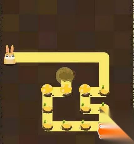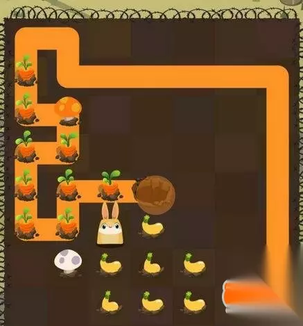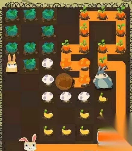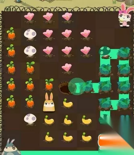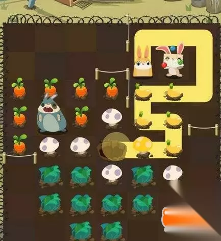 第三步:小白兔绕行到地图上方,开始吃光所有胡萝卜,要留一个蘑菇给小黄兔