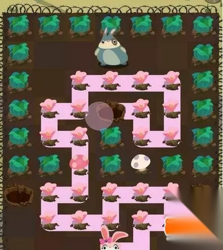 第二步:让小粉兔从地图中间的小花开始喂食,小粉兔只能吃一个蘑菇