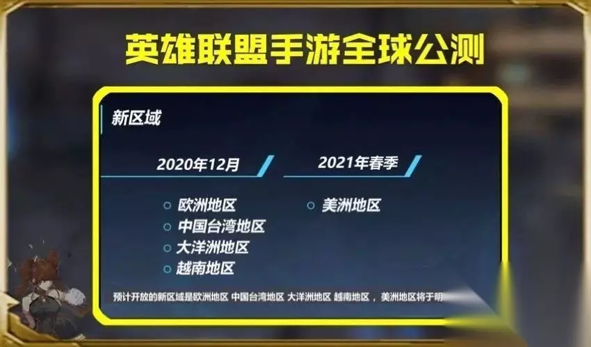 LOL手游27号公测时间介绍 1、首次地区开放性测试10月27日开启包括以下地区:韩国、日本、菲律宾、新加坡、马来西亚、印度尼西亚、泰国。 在韩国及日本等大部分地区,玩家可以用拳头账号登陆游戏,并会根据对《英雄联盟》端游的投入获得相应奖励。 2、游戏将在12月首周起全球逐步公测预计开放的新区域为欧洲、中国台湾、大洋洲、越南。根据繁中官网的信息,还包括中东、北非、俄罗斯、土耳其。美洲将在2021年春季上线。