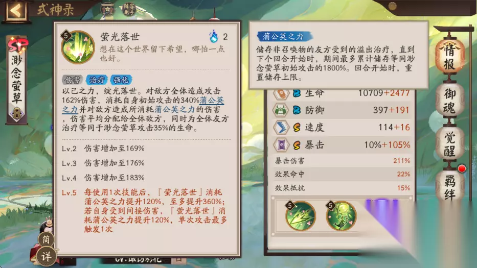渺念萤草是r级别萤草的sp化式神,拥有比萤草更高的奶量和更高的伤害,并且在pve副本中,pvp对战中都有不错的表现,该式神的治疗量和攻击力有关,所以攻击属性为s级,伤害又和暴击爆伤有关,所以暴击和速度都是s级,成为一个暴力的奶妈式神就是这个角色的定位。渺念萤草的一技能不会消耗鬼火释放平a,对敌方单体造成伤害会消耗自己身上的蒲公英之力再次造成伤害,升到满级普攻伤害增加20%,蒲公英之力伤害会增加2倍。蒲公英之力的效果是可以储存友方溢出的治疗量,最多可以储存sp萤草攻击1800%的量,如果加上二技能带来的被动效果,每有345%的蒲公英之力就能增加一段追加攻击,所以萤草的普攻最多可以打出5段的伤害,这个伤害数值还是很恐怖的,所以黑蛋资源多的玩家可以将普攻也升满。