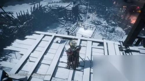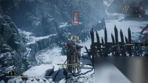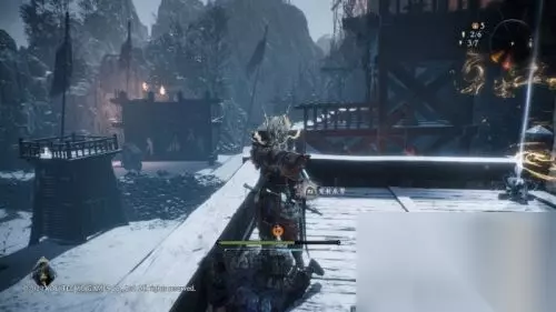 旌旗三:孙坚军旧营外 稍微有些隐蔽的一处旌旗,从箭头所示位置跳上高台绕进去即可。孙坚军旧营位置在主战场对面(以壕沟为界),在地图右侧方向(面对城楼方向为前)。