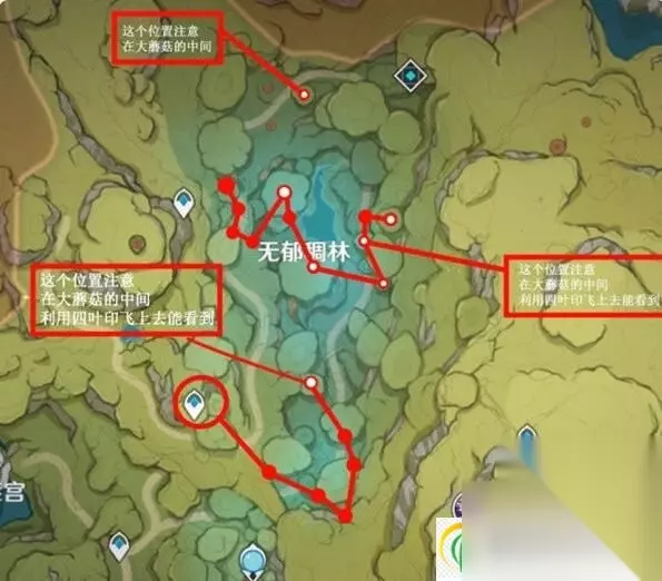 原神树王圣体菇哪里多?树王圣体菇是新4星角色柯莱的突破材料之一,玩家想要培养柯莱的话,就需要使用到大量的树王圣体菇。树王圣体菇是通过在野外采集获取,主要分布在须弥地图上,那么树王圣体菇主要分布在哪些位置?采集路线是怎样的呢?下面就一起来看看吧。 原神树王圣体菇位置分布图级采集路线分享 1、无郁稠林 首先来到无郁稠林,这里分布有大量的树王圣体菇,如下图所示: 图中有白色标记的都是在大蘑菇中间夹层里的,红色的连接线表示着采集路线。