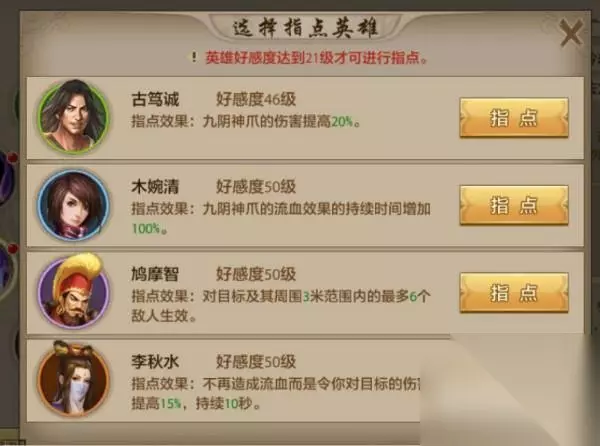 【九阴神爪】 指点效果: 古笃诚:九阴神爪的伤害提高20%。九阴神爪作为峨眉职业攻击伤害最高的技能,直接提高伤害20%非常的实用。 木婉清:九阴神爪的流血效果的持续时间增加100%。九阴神爪的流血时间,效果一般,流血的伤害不是特别高。 鸠摩智:对目标及其周围3米范围内的最多6个敌人生效。将单体技能效果变为了群攻技能,非常的强力,峨眉职业的群攻技能还是很缺少的。 李秋水:不再造成流血而是令你对目标的伤害提高15%,持续10秒。技能效果非常的强大,直接提升峨眉整体的伤害。