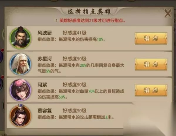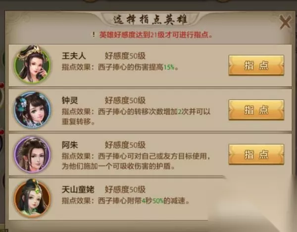 【西子捧心】 指点效果: 王夫人:西子捧心的伤害提高15%。西子捧心的技能伤害本身就非常的高,所以增加技能伤害效果非常的实用。 钟灵:西子捧心的转移次数增加2次并可以重复转移。增加了技能的群体攻击能力。技能效果非常的不错。 阿朱:西子捧心可对自己或友方目标使用,为他们施加一个可吸收伤害的护盾。阿朱是七日登录礼包中赠送的拜帖,所以是前期最容易获得的紫色英雄拜帖,而且技能辅助效果非常出色。 天山童姥:西子捧心附带4秒50%的减速。减速技能对于峨眉职业来说还是非常重要的技能效果。