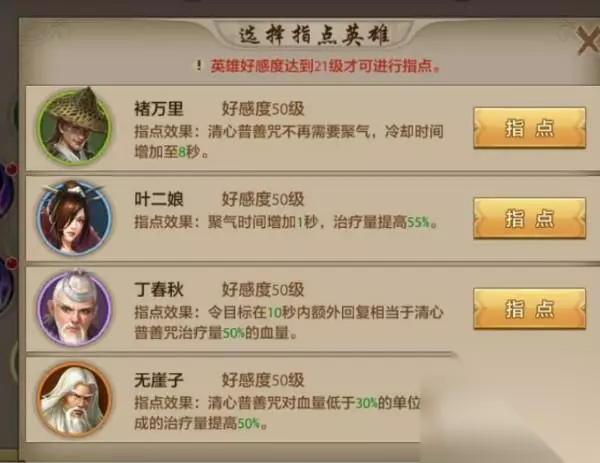 【清心普善咒】 指点效果: 褚万里:清心普善咒不再需要聚气,冷却时间增加至8秒。这个技能效果,在挑战英雄试炼玩法时,非常的好用。 叶二娘:聚气时间增加1秒,治疗量提高55%。可以提升治疗量的技能效果,对于峨眉来说都非常不错的技能。 丁春秋:令目标在10秒内额外回复相当于清新普善咒治疗量50%的血量。可以为目标增加一个持续回血的BUFF。 无崖子:清心普善咒对血量低于30%的单位造成的治疗量提高50%。很强力的技能效果,在很多危险的情况下,可以起到很好的作用。