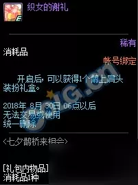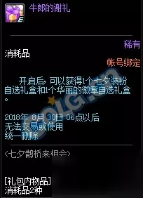 活动奖励: 织女的谢礼和牛郎的谢礼。可以获得鹊上肩头装扮礼盒和七夕装扮自选礼盒,还有华丽的徽章自选礼盒。