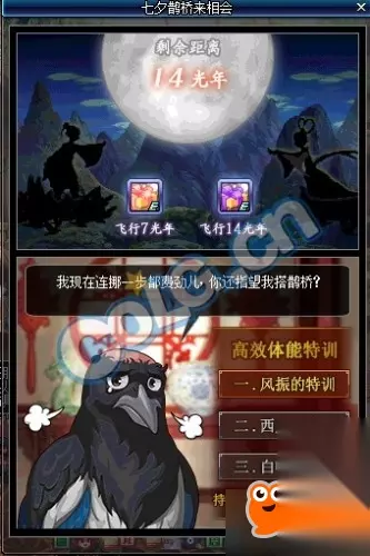活动时间: 2018年8月16日——2018年8月30日 活动内容: 每天登录游戏可获得[特训券礼盒],在推荐地下城收集[喜鹊特训券]帮助喜鹊特训,每完成一阶段喜鹊的特训可获得1个[喜上眉梢礼袋],完成1天的特训后牛郎和织女的距离会缩短1光年,当牛郎和织女的距离分别为7/0光年后(初始距离缩短14光年),勇士们分别可以获得1个[织女的谢礼]/[牛郎的谢礼]