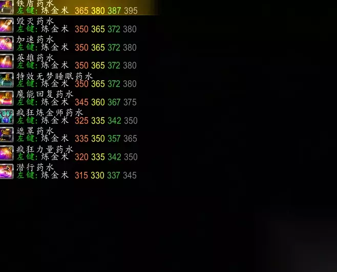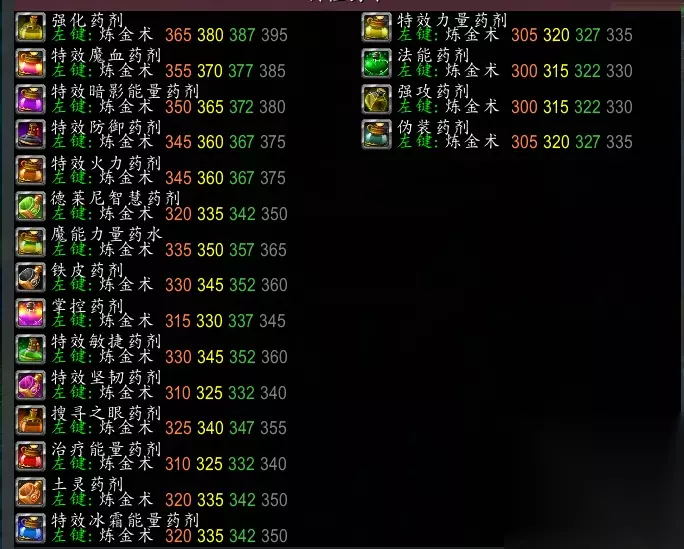在TBC阶段炼金术可选择3个方向发展,分别是药剂大师,药水大师,转换大师。 这三个分支都需要完成相对应的任务才能掌握,学成后的作用是制作对应的物品时有概率获得额外的成品,就是大家所说的暴击。 当我们的炼金术熟练度到达325点以后,就可以在地狱火半岛找到炼金大师接取三个分支的任务。 药水专精需要去生态舰杀死植物学家弗雷温获得《植物学家的指南》、5瓶超级治疗药水,5瓶超级法力药水和6瓶特效无梦睡眠药水,提交任务后便可称为药水大师。药水又可以分为功能性药水、防护药水、回复药水三类。
