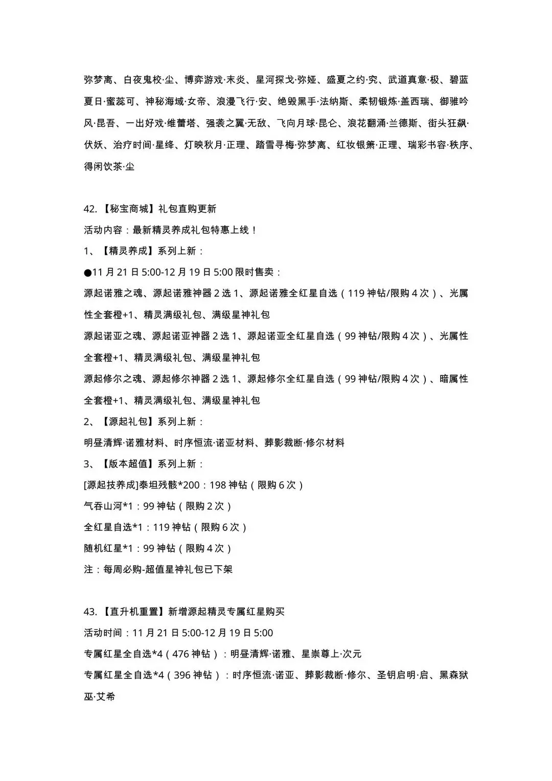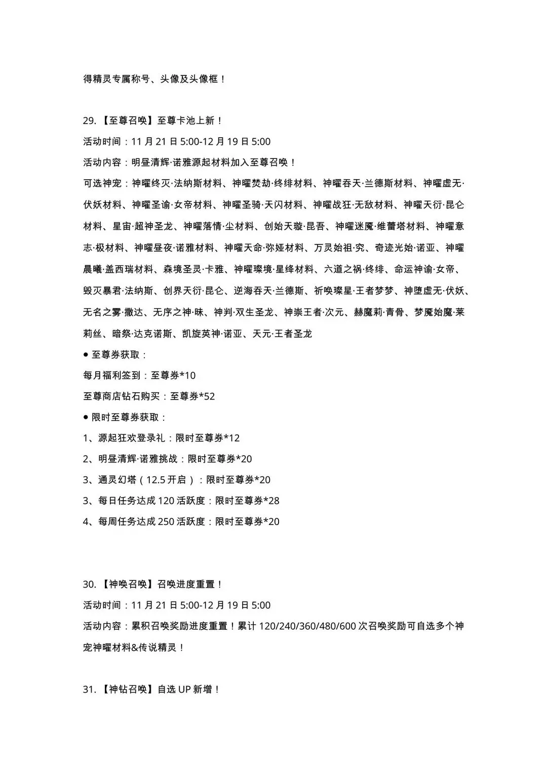 源起狂欢登录礼、大神帮打、战力狂飙大赛、生日竞技王、竞技大赛之自由对决、灵犀绘手(11.28开启)、斗技夺魁(11.28开启)、通灵幻塔(12.5开启)、王牌战队(12.12开启)