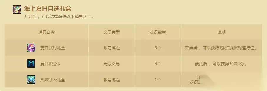 海上夏日自选礼盒这个要重点来说下了。首先这里面聪明的人都会选积分卡或者热辣泳衣礼盒。 因为在新版本中开放了积分商城,而3X800=2400积分可是可以买到很多东西的,例如24个深渊通行证,大量的强烈的气息罐子等等。 同时热辣泳衣礼盒是账号绑定,所以你可完全可以选择大号购买一套礼包,然后把上衣礼盒丢给小号去用。 这次的特别上衣是直接覆盖腿部时装的,即使你只穿一件特别上衣,那么女性角色也会显示连体泳衣或比基尼泳衣的样式。所以混团的小号,例如光兵、奶妈或者女鬼剑等等,来一件免费的比基尼衣服可谓超值。