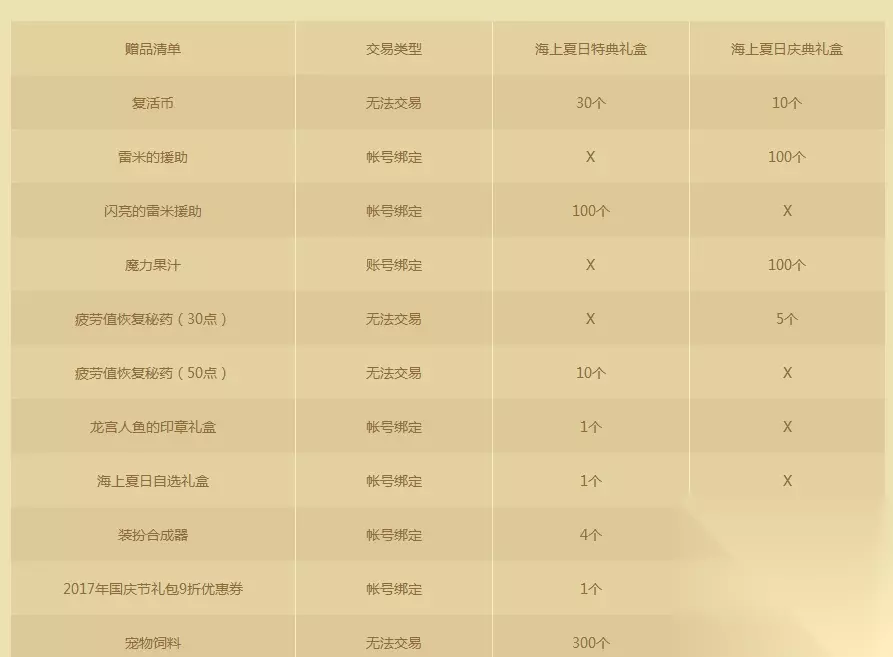 2、赠品 和往年的赠品几乎没有太大差别,其中复活币、雷米、疲劳药啥的都是礼包常客了,而纹章对于想追求极限属性的玩家来说还是一个非常不错的东西。 称号属性依然鸡肋,不过如果能用夏日宝珠搞出30四维的附魔,拿去给奶爸或者奶妈用还是相当不错的。其他称号仅仅过渡用,想要属性建议还是等年套或者国庆称号吧。 宠物今年没有增加技能等级,而是直接增加10%的黄字,而深渊中有多少SS装备是带黄字的很多老玩家也心中清楚,所以也只是过渡使用,不过宠物有40四维,奶爸奶妈对体精智力还是相当的好用。 光环也是15四维、15单属强,比不上国庆光环,不过也算是蚊子腿提升吧。