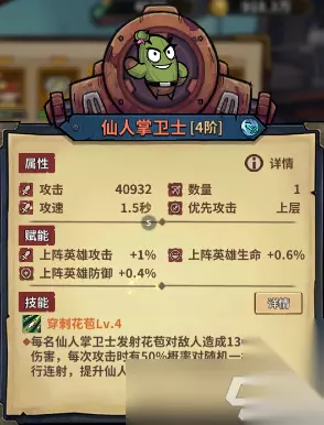 仙人掌卫士 颜值:★★☆☆☆ 强度:★★☆☆☆ 颜值介绍:痞老板?是你吗。 强度介绍:连射的输出实际表现一般,单体不如机械猫,冰冻目前没有什么角色打配合,有待观望。 特别介绍:这攻击但凡给英雄就起飞,可惜英雄给的是防御,那就是废物。