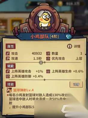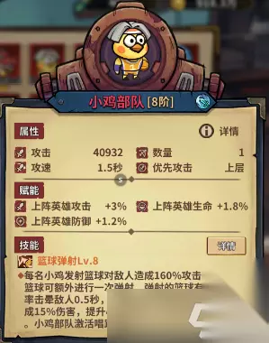 小鸡部队 颜值:★★★☆☆ 强度:★★★★★ 颜值介绍:全民指挥官们大家好,我是练习时长两年半的新晋指挥官繁羽。 强度介绍:高贵的眩晕,平均6s晕0.5s用处不大不小,这个随从重点还是特殊技能。 特别介绍:释放技能就加5s攻速,前期可能会有一段空窗期,后面就是全覆盖,全程15%攻速光环,香麻了。