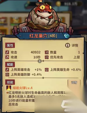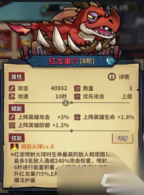 红龙巢穴 颜值:★★☆☆☆ 强度:★★★★☆ 颜值介绍:这龙放堡垒上真的很大,就是这个眼睛,看起来像没睡好。 强度介绍:攻击间隔超长的蓄力随从,实际伤害不俗,可惜间隔时间太长用来挂灼烧收益不高,灼烧一共才持续4s,蓄力需要6s。 特别介绍:魔法护盾只有一次,300%攻击强度不明显。